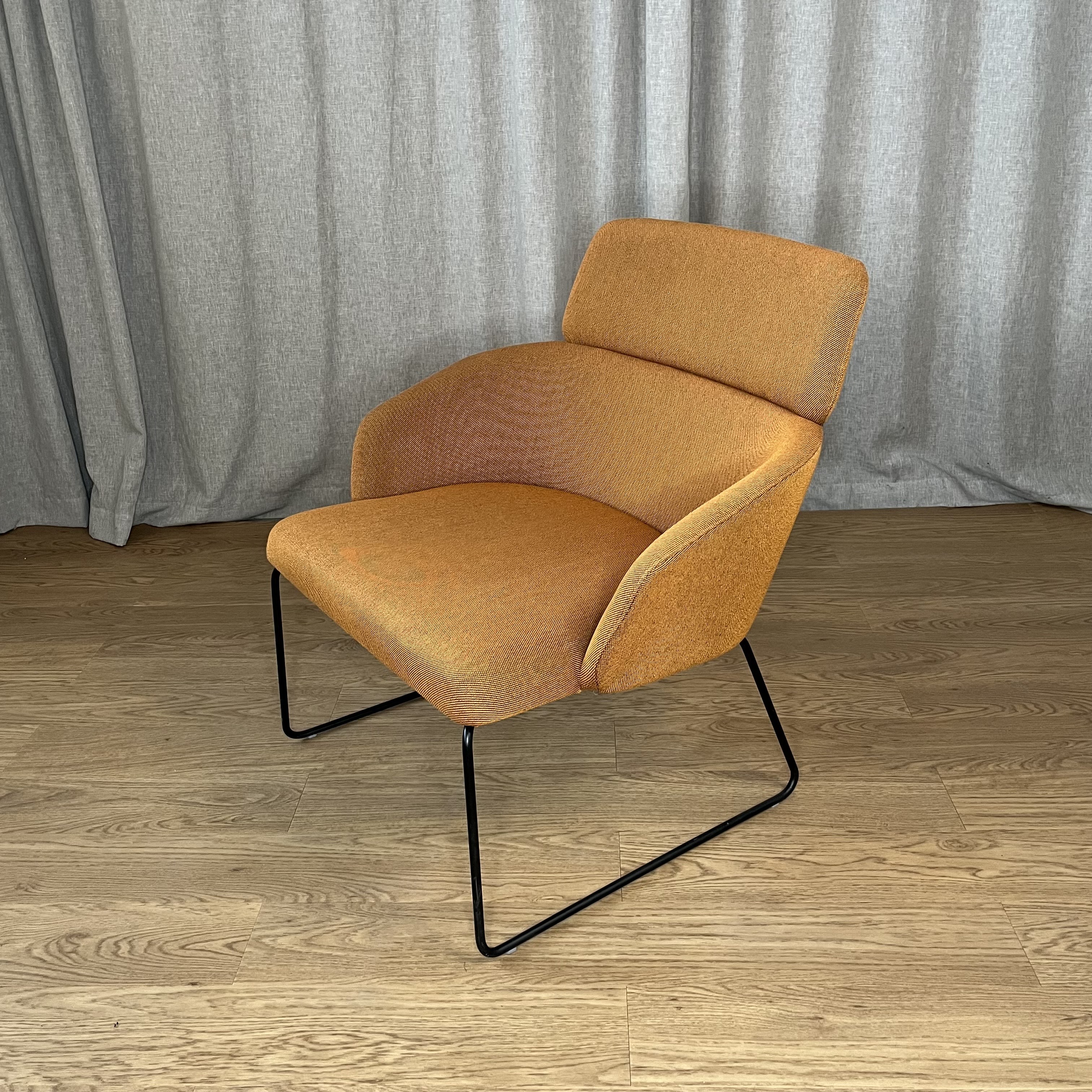 Capdellin Concord-malliston nojatuoli tyylikkäällä lenkkijalalla. Tuoli on ollut showroomilla mallituolina ja on edelleen erittäin hyvässä kunnossa. Verhoilukangas on oranssinruskea. Concord on mainio valinta esimerkiksi toimiston aulatilaan tai majoitustilan lepotuoliksi. ERÄ: 1 kpl